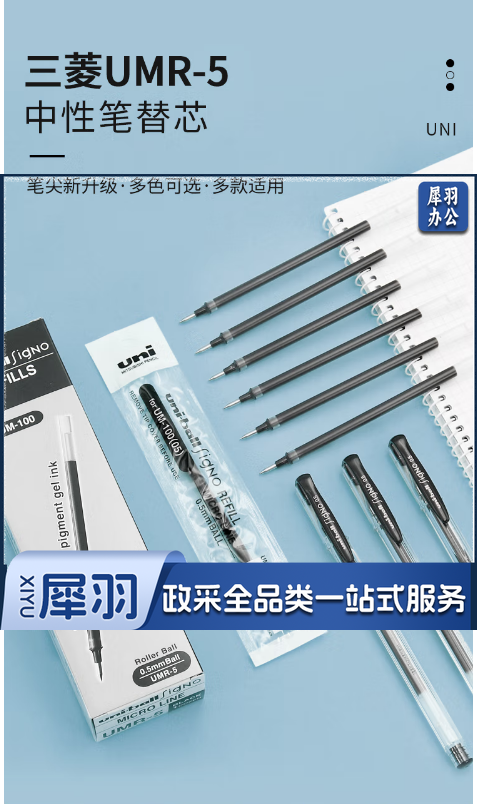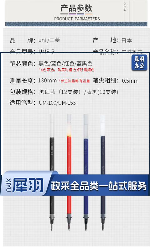 三菱(Uni)UMR-5中性笔芯(适用于UM-100笔)蓝黑色0.5mm12支装 单支价