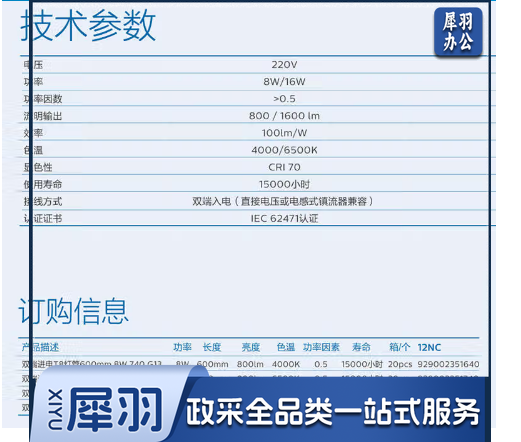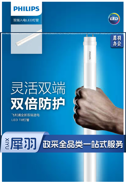 飞利浦(PHILIPS)T8 LED灯管双端进电1.2米22W(白光6500K )一只装