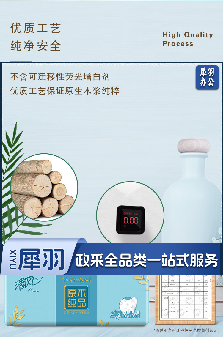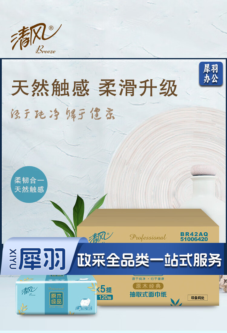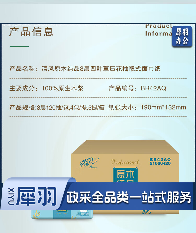 清风 原木纯品3层四叶草压花120抽抽取式面巾纸 4包每提 BR42AQ