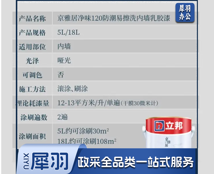 立邦乳胶漆京雅居净味120 防潮易擦洗内墙乳胶漆室内涂料油漆面漆自刷 【工厂发货】 5L