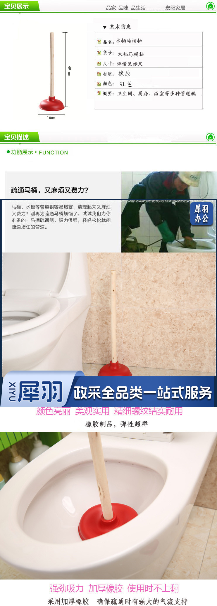 强力卫生间木柄马桶吸 管道疏通器 马桶抽子皮搋子 木把揣子