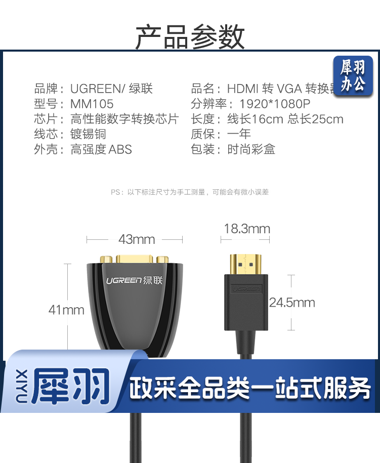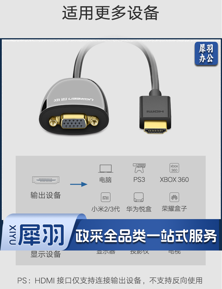 绿联(UGREEN)HDMI转VGA线转换器 高清视频转接头 笔记本电脑盒子机顶盒连电视显示器投影仪线 黑 40253