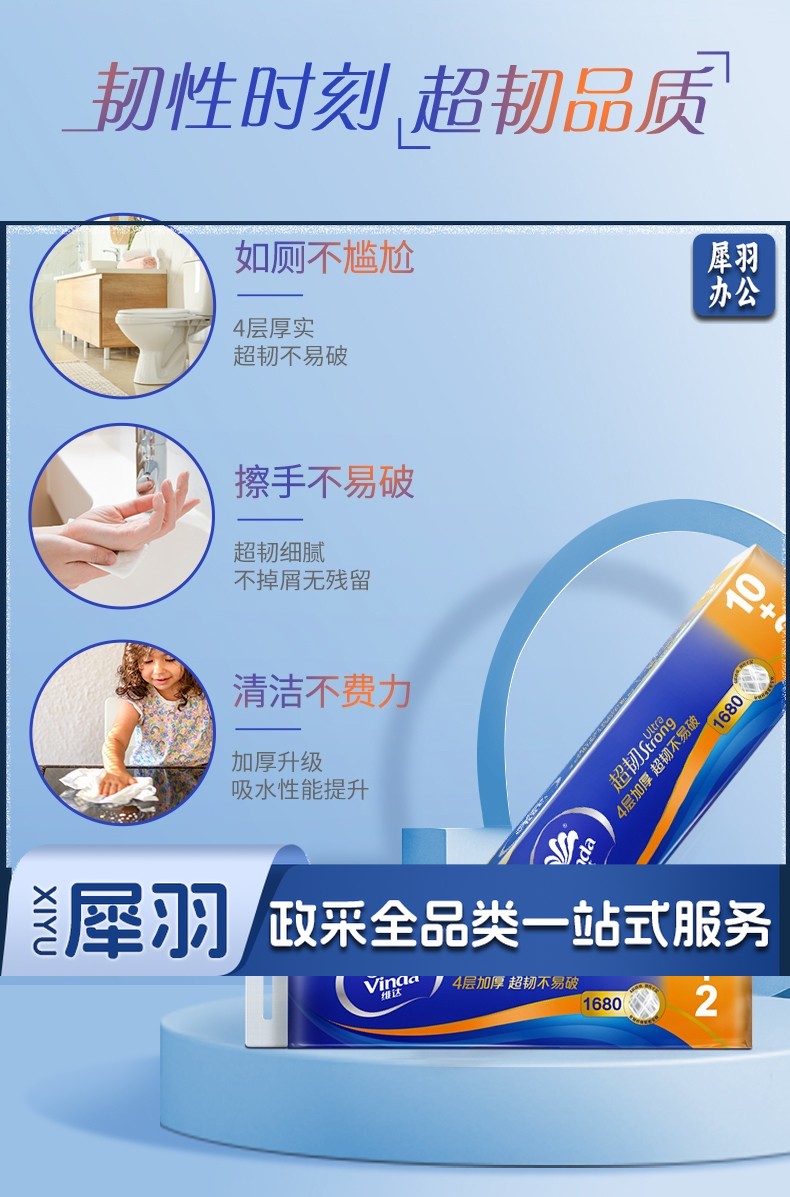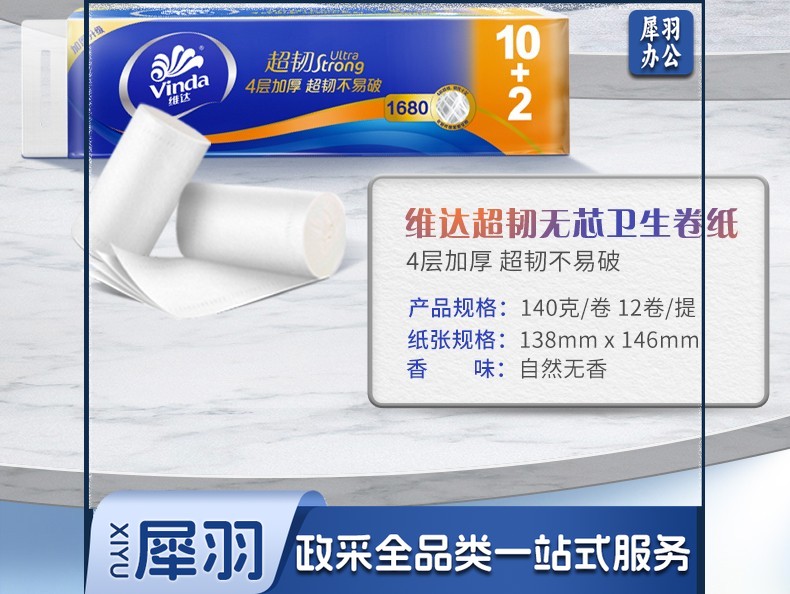 维达(Vinda)卷纸 超韧无芯卷纸140克12卷 4层加厚 卫生纸卷筒纸