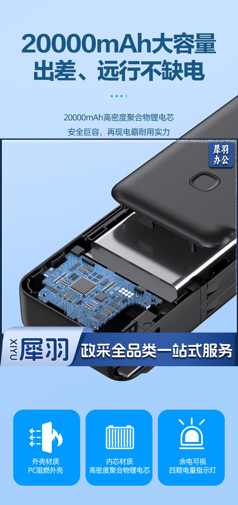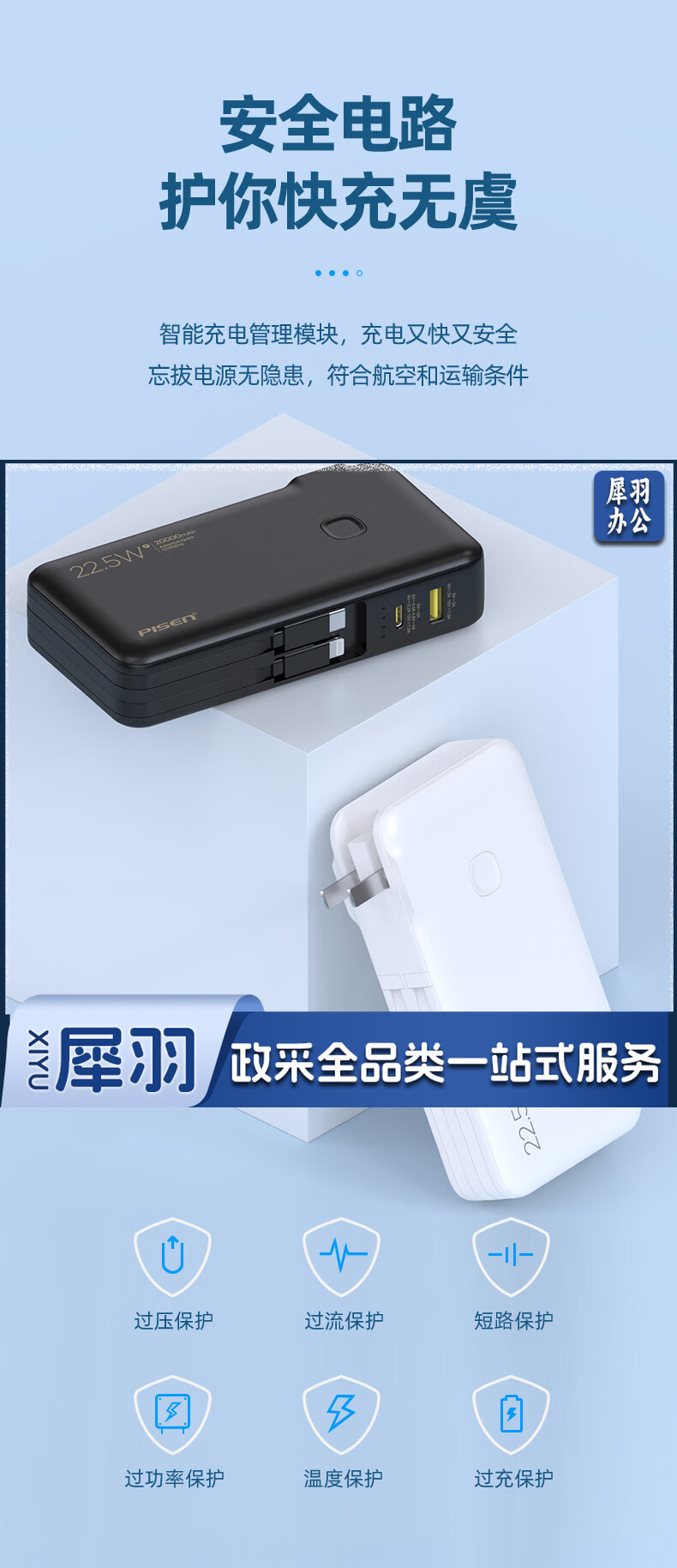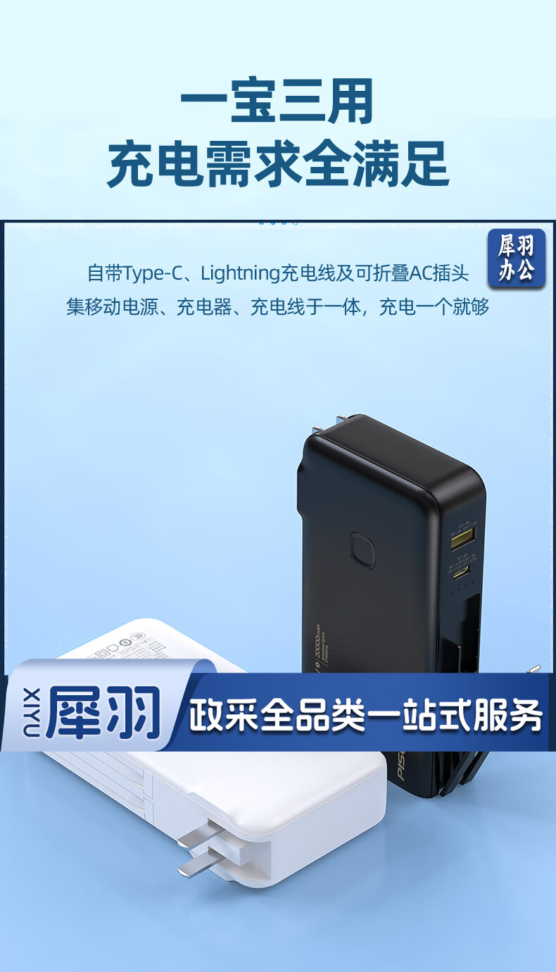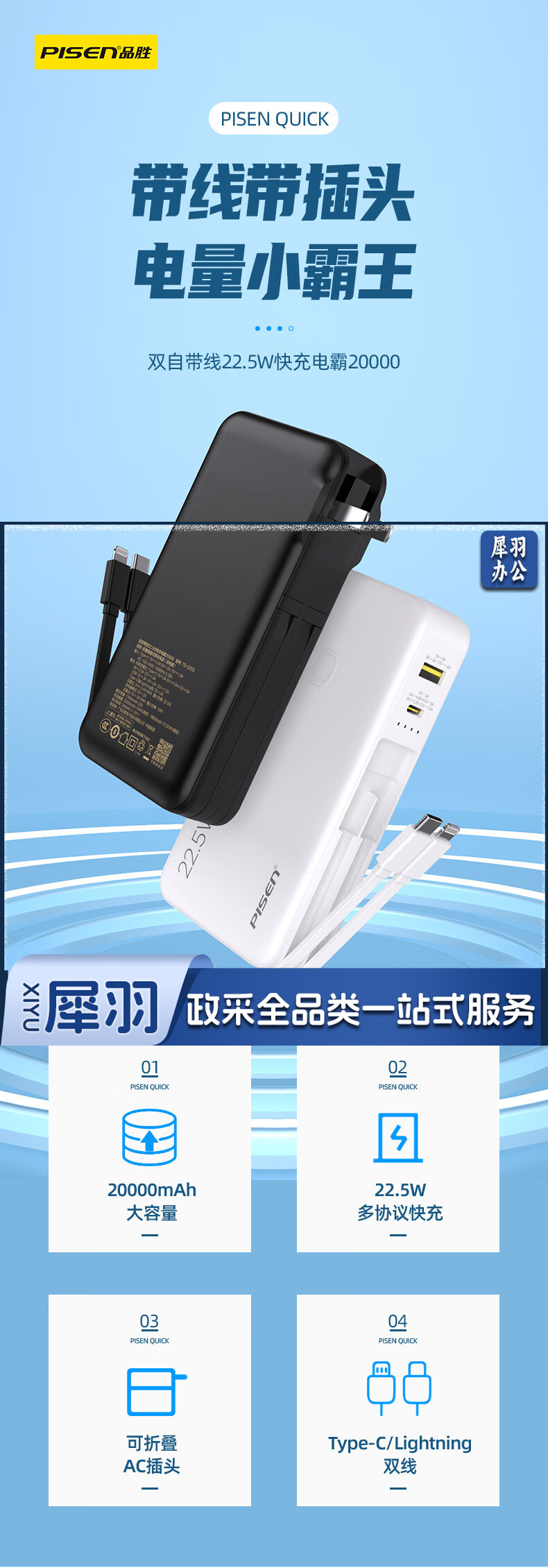 品胜自带双线充电宝20000毫安时大容量22.5W快充插头充电器二合一便携小巧户外移动电源适用苹果14华为小米白