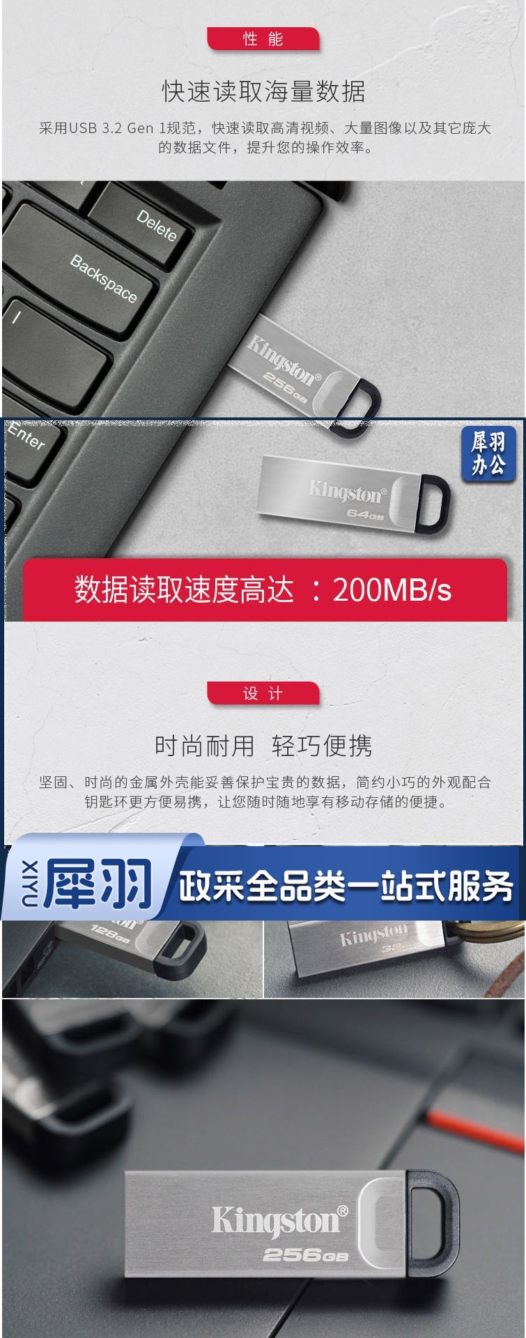金士顿(Kingston)DTKN 64GB USB 3.2 Gen 1 U盘 DTKN 金属外壳 读速200MB/s