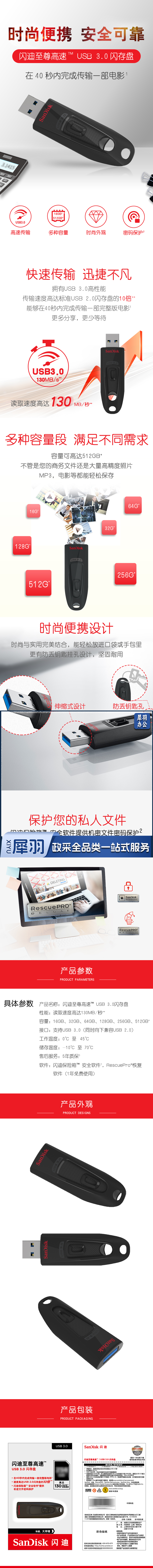 闪迪(SanDisk) CZ48 128GB USB3.0 U盘 至尊高速 黑色 读速100MB/s 经典USB3.0 U盘 高速安全可靠