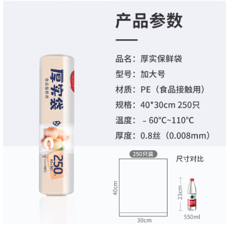 美丽雅 厚实保鲜袋食品级 点断式一次性塑料袋加大号250只40*30cm