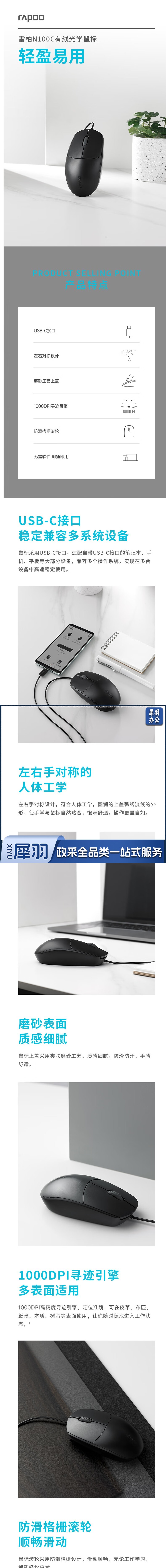 雷柏有线鼠标(Rapoo) N100C有线鼠标 办公鼠标 有线鼠标对称鼠标 笔记本鼠标 电脑鼠标 台式机有线鼠标 办公鼠标【Type-c接口】