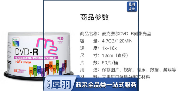 麦克赛尔(maxell)DVD-R光盘 刻录光盘 光碟 空白光盘 可打印光盘 A级M2系列16速4.7GB 桶装50片