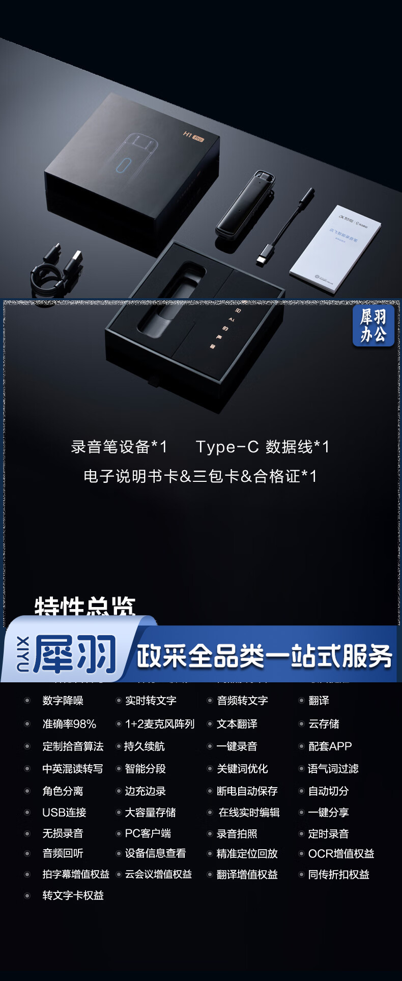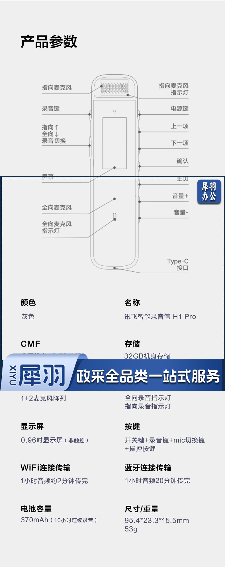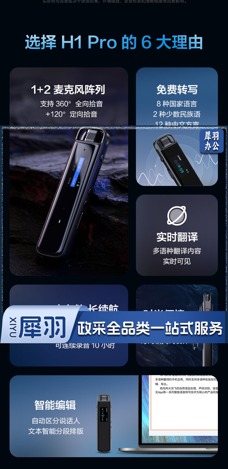 科大讯飞智能录音笔H1 Pro 转写助手 32G 专业高清降噪 会议录音转文字 录音笔 实时翻译