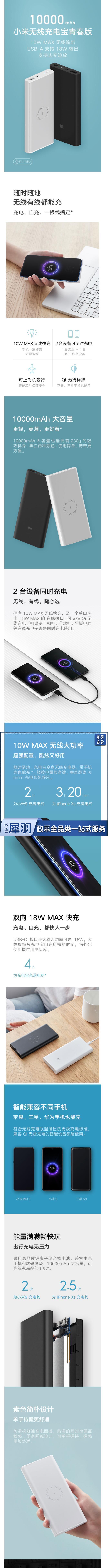 小米无线充电宝青春版 原装10000毫安时 10WMAX无线输出 黑色 内含数据线适用小米10苹果安卓redmi手机充电宝