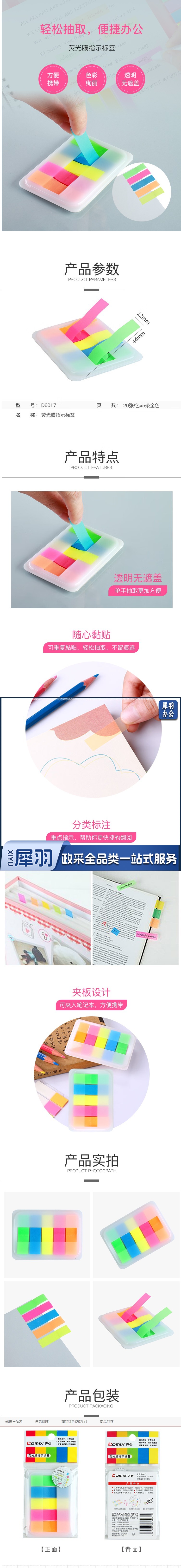 齐心(Comix)荧光膜索引标签指示贴/荧光贴/便签条/便签纸/透明便利贴(44x12mm)20张*5色 D6017