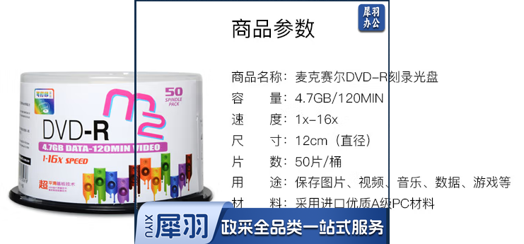 麦克赛尔(maxell)DVD-R光盘 刻录光盘 光碟 空白光盘 可打印光盘 A级M2系列16速4.7GB 桶装50片