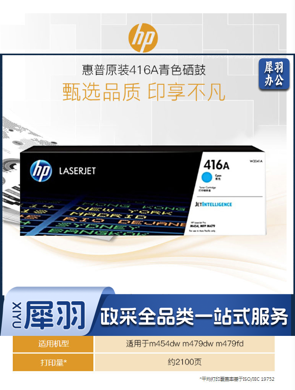 惠普(HP) W2041A 青色原装硒鼓 416A(适用于M454nw/454dw/454dn/M479dw/M479fdw/M479fnw系列)(2100页)
