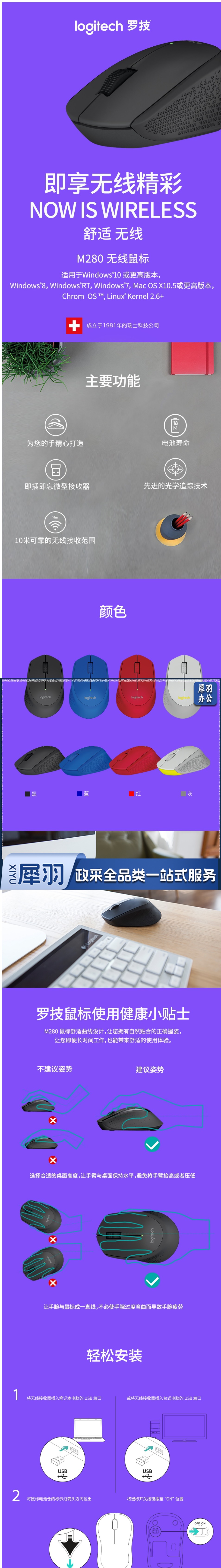 罗技鼠标(Logitech)鼠标 M280(M275升级款)鼠标黑色鼠标 无线鼠标家用鼠标商务鼠标USB鼠标办公鼠标右手鼠标人体鼠标工学鼠标 黑色鼠标