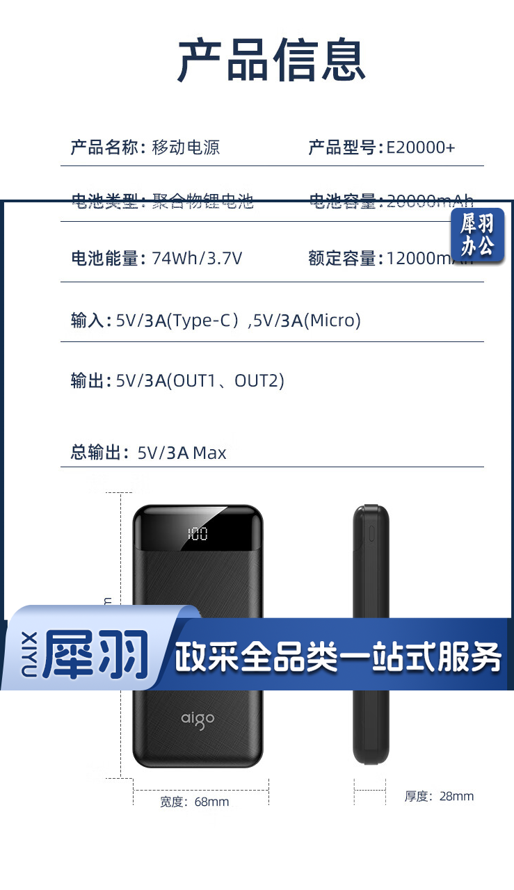 爱国者充电宝(aigo)充电宝 移动电源E20000+ 充电宝20000毫安