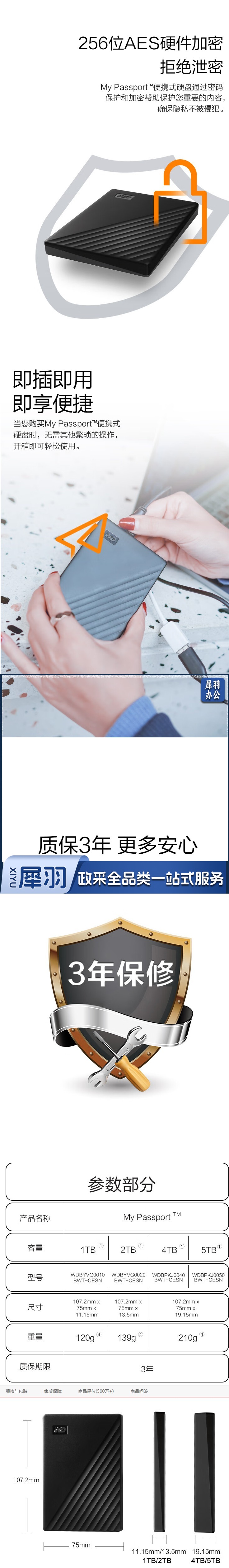 西部数据 2TB 移动硬盘 USB3.0 My Passport 移动硬盘 随行版2.5英寸 黑 机械硬盘 手机笔记本移动硬盘 外置外接存储 兼容Mac