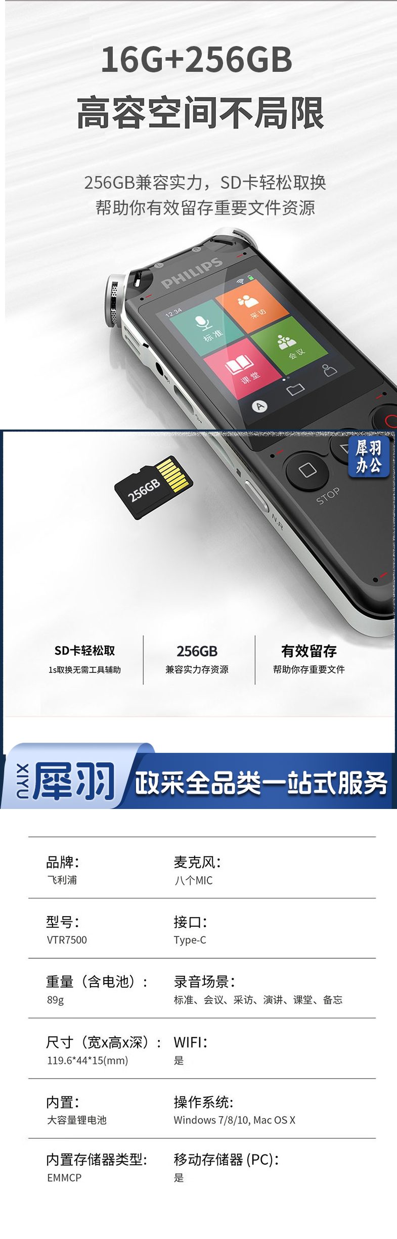 飞利浦录音笔(PHILIPS)录音笔 VTR7500 16GB 语音转文字 录音笔八麦克专业高清降噪录音笔 旗舰智能AI一体机
