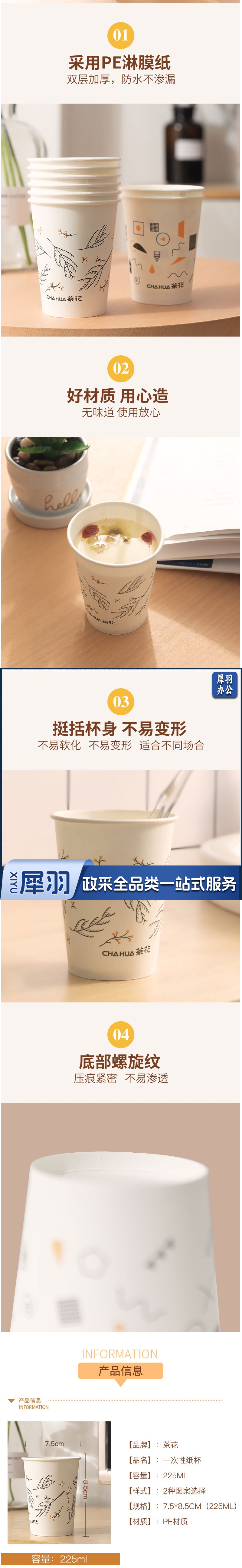茶花(CHAHUA)纸杯 一次性纸杯子纸杯热水纸杯防漏纸杯 防烫纸杯 无蜡健康纸杯 淋膜纸杯 杯喝水杯【1包×50只装】225ML 1包装