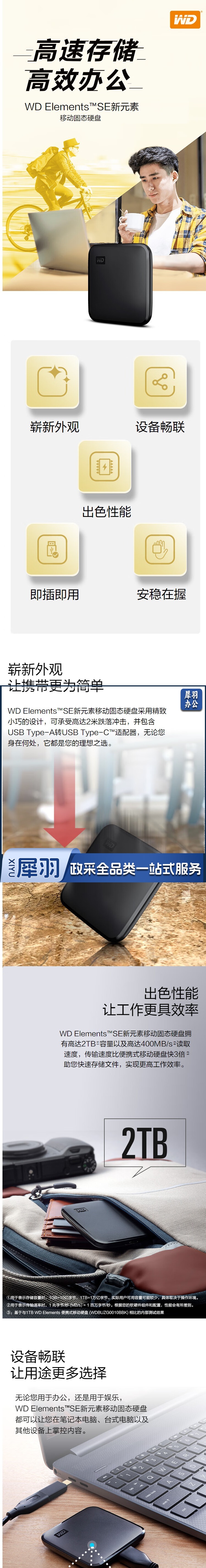 西部数据(WD) 移动固态硬盘 2TB 移动固态硬盘(PSSD)移动固态硬盘Elements SE新元素 SSD type-c接口 移动固态硬盘 手机笔记本外置外接