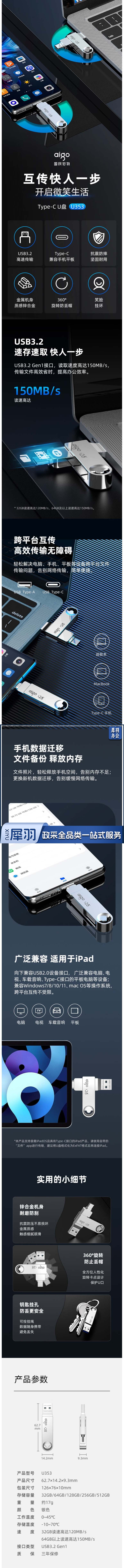 爱国者(aigo)128GB Type-C USB3.2 双接口手机U盘 U353 速存读取 多平台兼容 hysm-241127140717