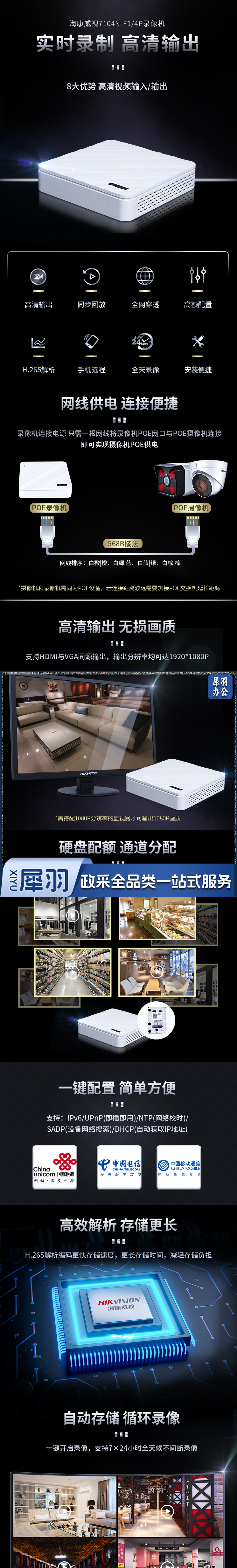 海康威视 4路带网线供电 硬盘录像机 主机 DS-7104N-F1/4P(B)