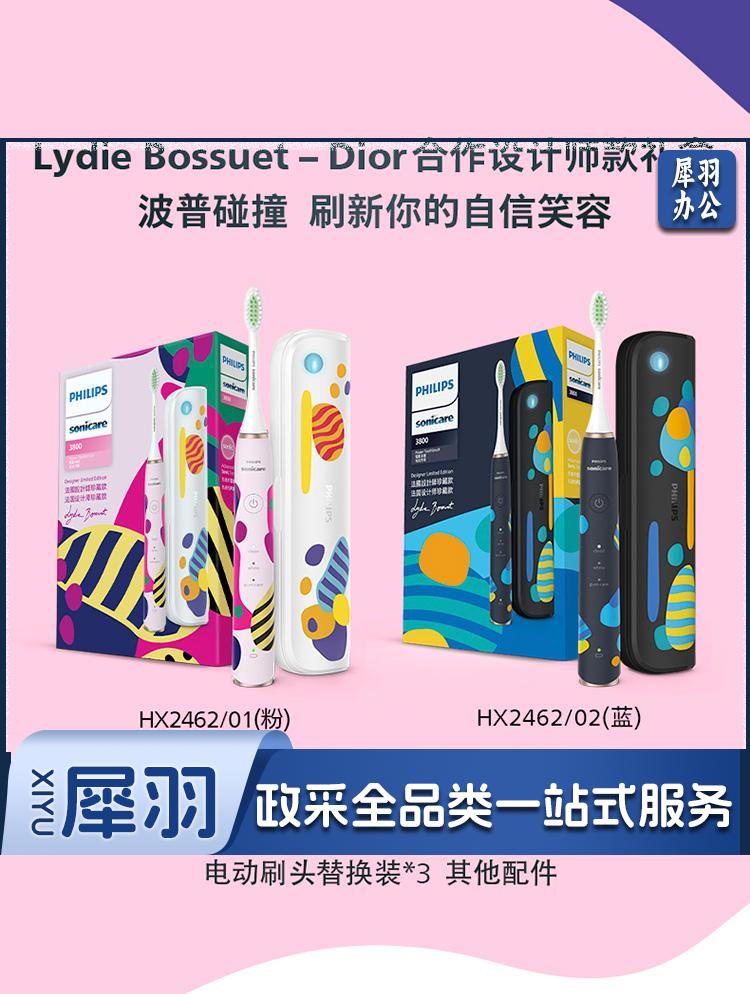 飞利浦(PHILIPS)电动牙刷成人情侣春节新年礼物 带3支刷头+杀菌牙刷盒Lydie Bossuet-Dior合作设计师款HX2462/01粉