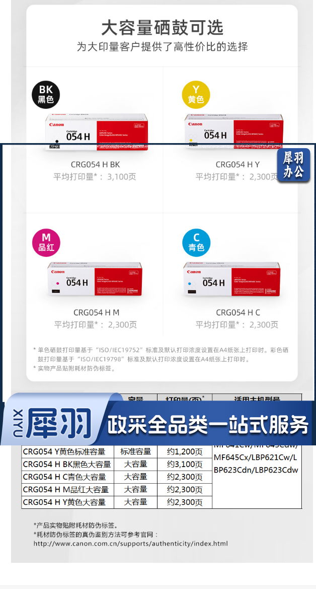 佳能(Canon) CRG054H 黄色 黑色 蓝色 红色 请备注 适用设备iC MF641Cw、MF643Cdw、MF645Cx、LBP621Cw、623Cdn、623Cdw (单位:个)
