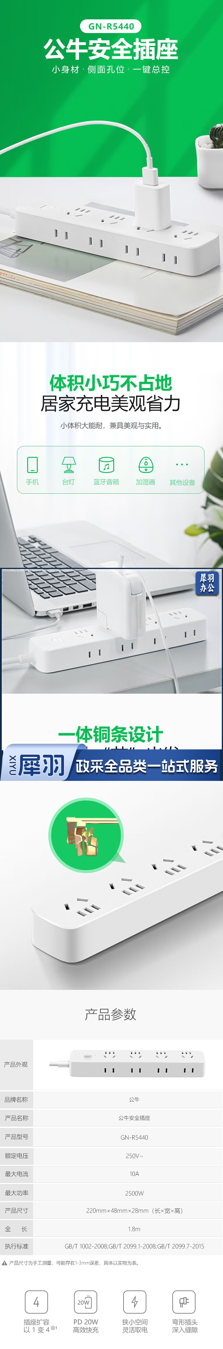 公牛 新国标插座/插排/排插 R5440四位五孔+侧边四个4孔全长1.8米