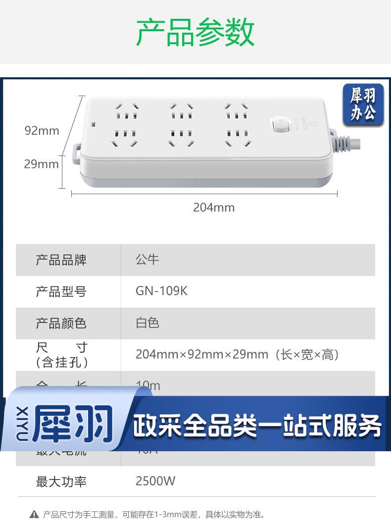 公牛(BULL) 新国标插座/插线板/插排/排插/接线板/拖线板 6位总控全长10米 GN-109K