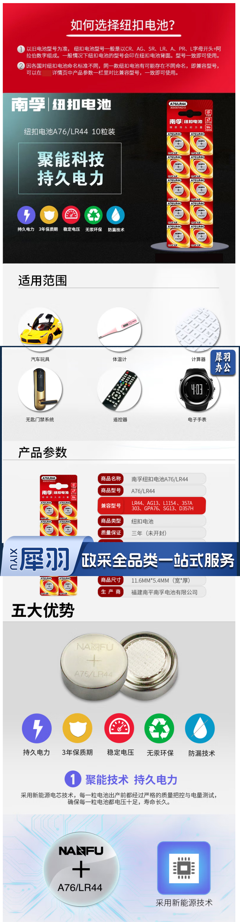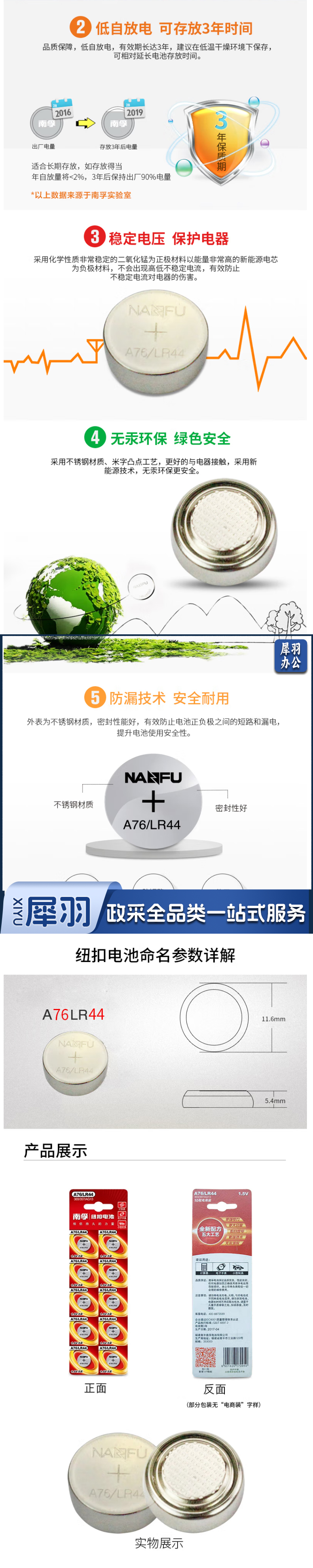 南孚(NANFU)纽扣电池10粒A76/LR44电池