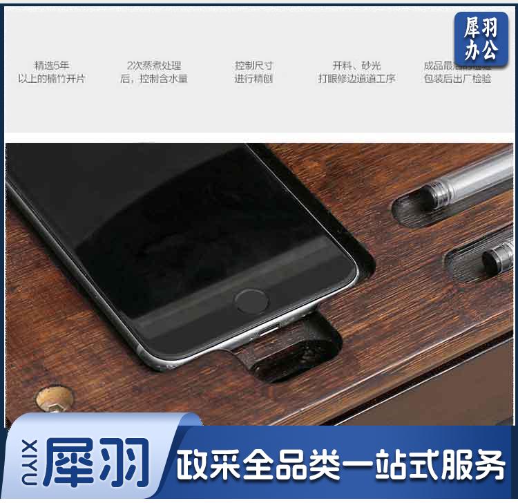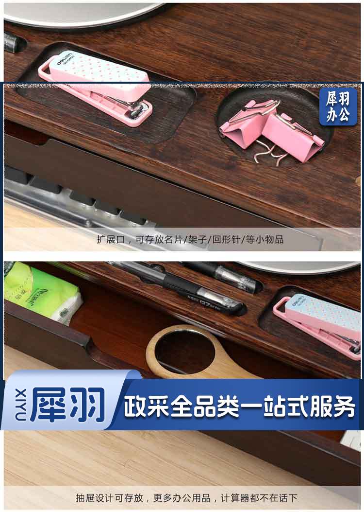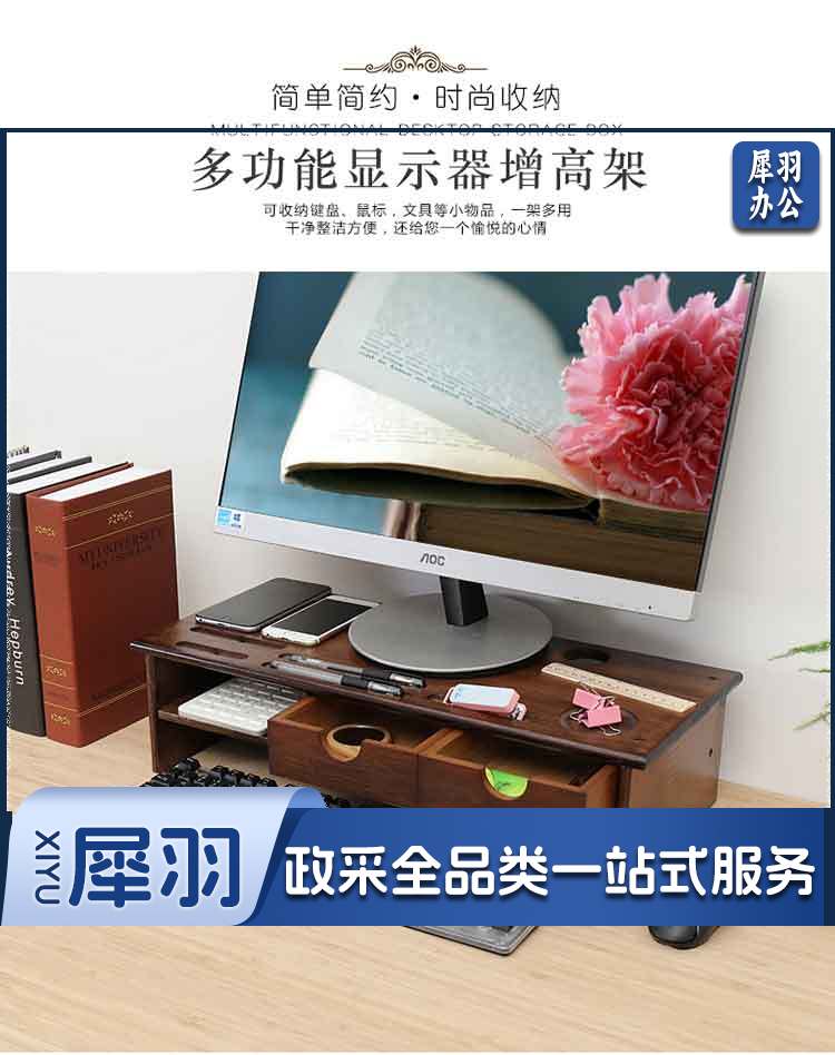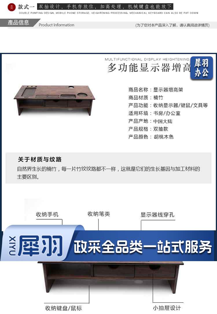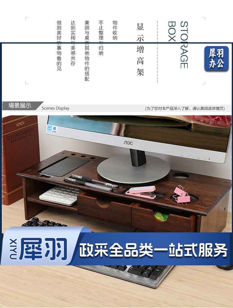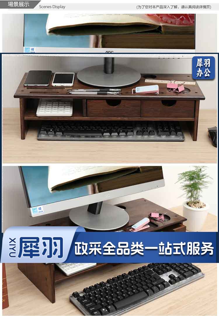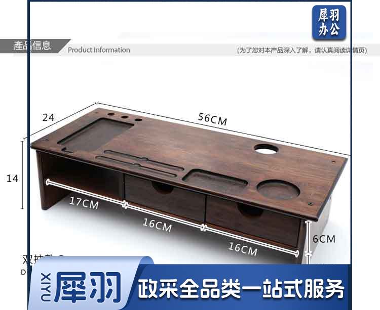 双抽屉胡桃木色双层显示器增高架 办公室电脑底座托架 收纳整理置物层 键盘收纳架 桌面收纳架