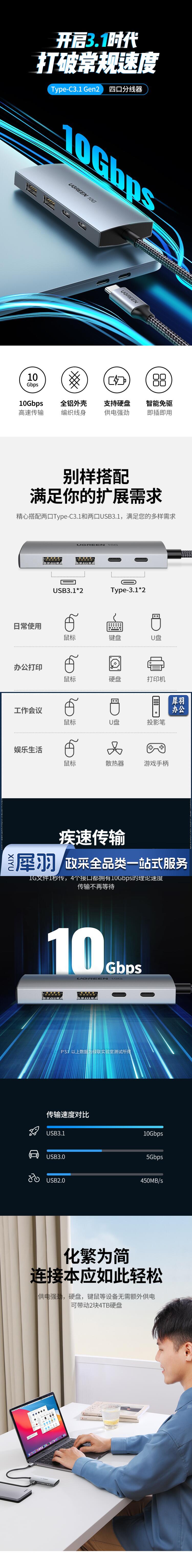 绿联 30758 Type-C3.1分线器扩展坞 USB-C3.1 Gen2高速4口拓展坞集线器HUB 一拖四转换器延长线 0.25米
