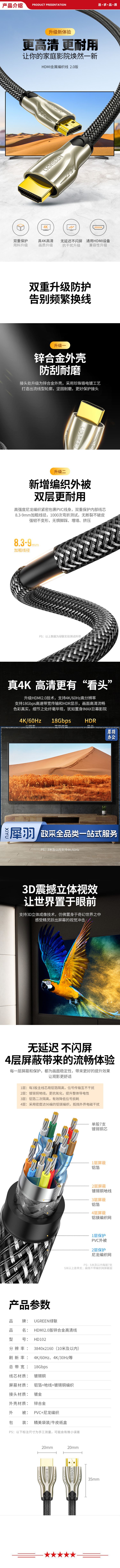 绿联 UGREEN 11195 HDMI高清线2.0版 HD102 3D信号音视频线 4K数字高清线 圆线 10米 bwsj-2022080724028