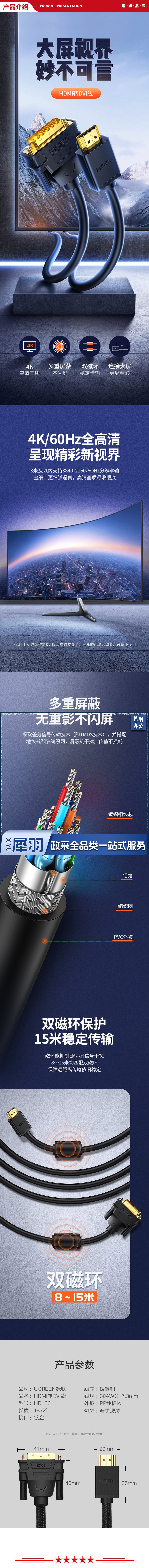 绿联 UGREEN 50749 HDMI转DVI转换线 HD133 4K60Hz高清线双向互转视频线 1米 -