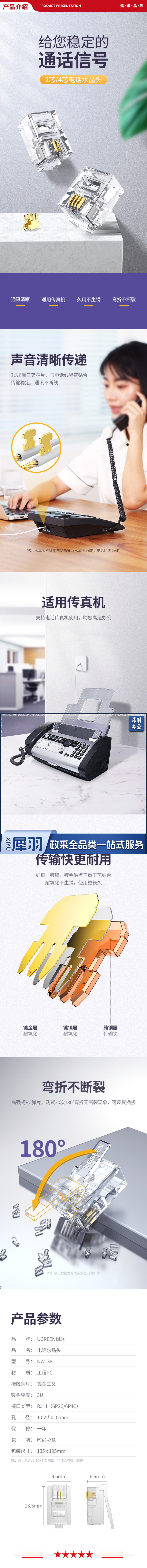 绿联 UGREEN NW138 电话水晶头 80105 6P4C电话线接头 RJ11语音电话线连接器 座机传真机全铜镀金插头 2芯50个装