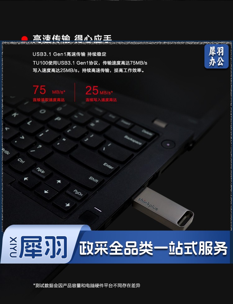 联想(thinkplus)USB3.1高速传输U盘 移动闪存优盘 金属商务U盘 大容量电脑优盘 TU100金属优盘 32G