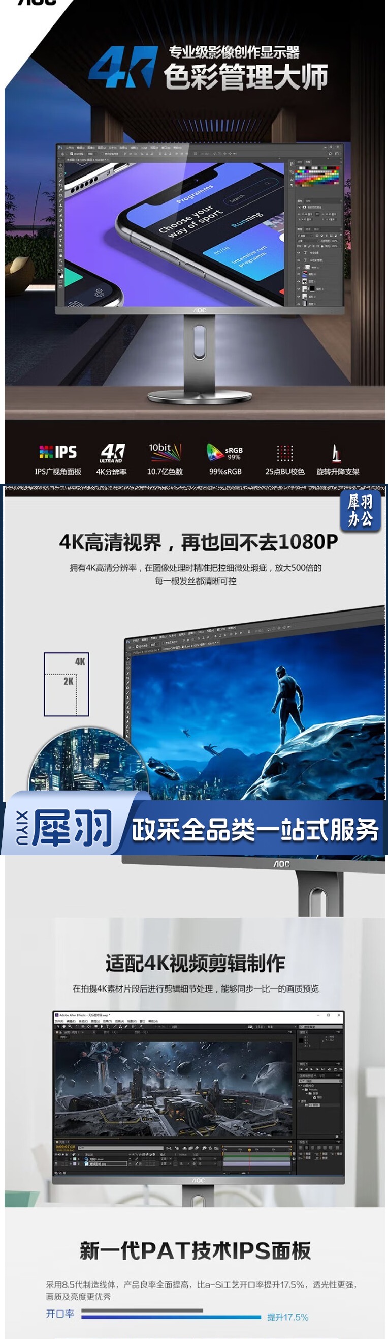 冠捷/AOC 27英寸液晶显示器 2K IPS广视角 106%NTSC广色域 商用办公 节能 低蓝光不闪 旋转升降液晶显示器 U2790PQ