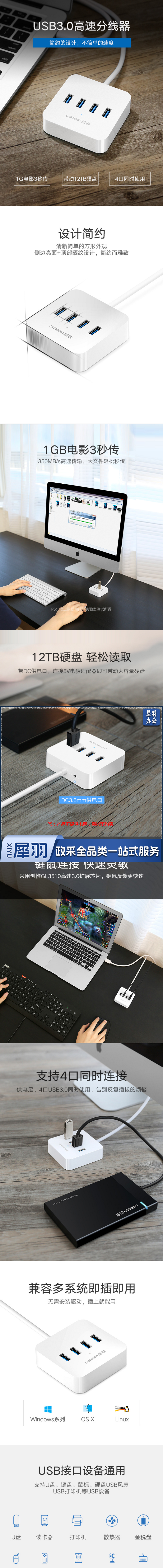 绿联USB3.0分线器 30221 高速4口拓展坞 USB集线器HUB扩展坞 笔记本电脑一拖四多接口转换器转接头延长线1.5米 202301063783