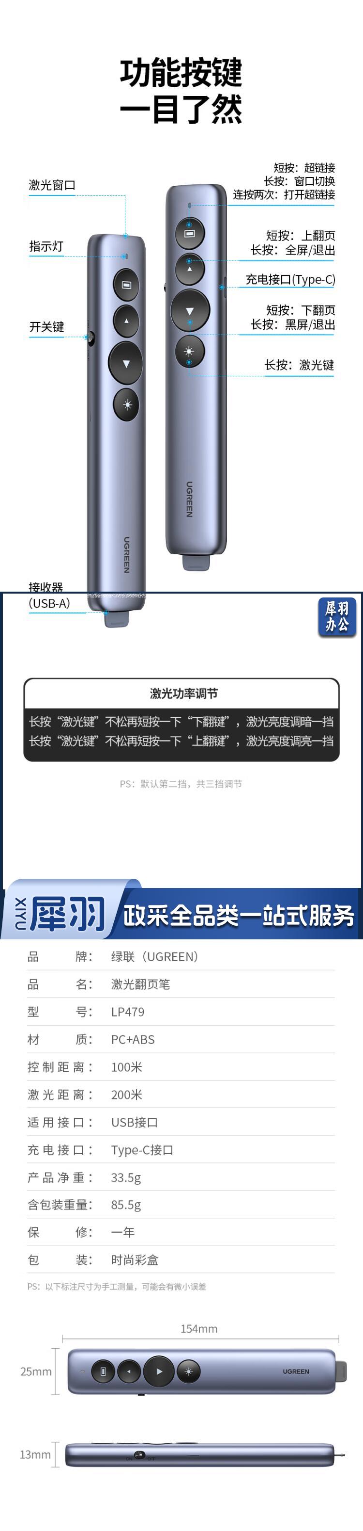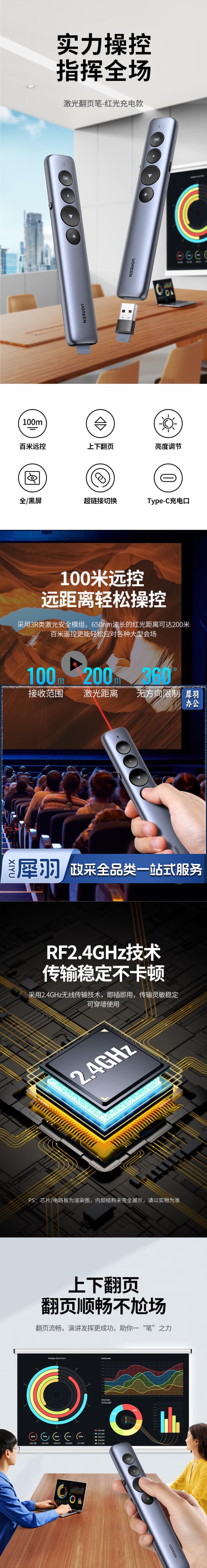 绿联 15153 翻页笔 激光笔可充电 PPT投影笔教师教鞭电子演讲笔 多媒体幻灯片无线演示课件笔