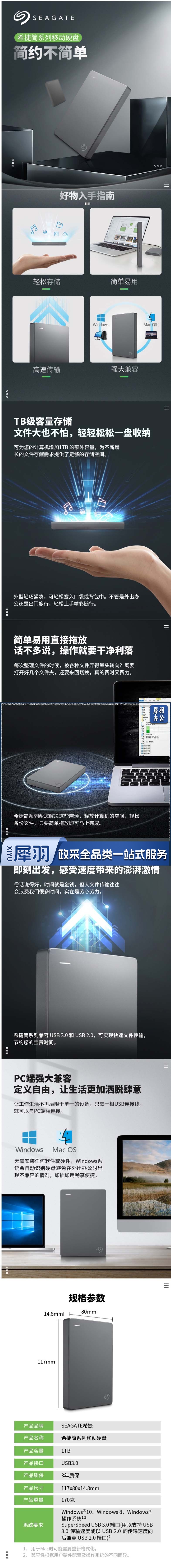 希捷 STJL1000400 1TB USB3.0移动硬盘 2.5英寸 灰色(单位 块)