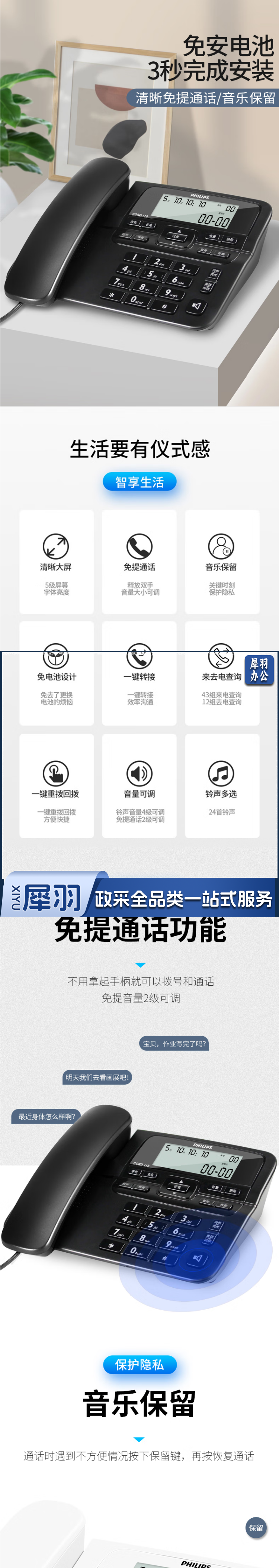 飞利浦(PHILIPS)CORD118 电话机座机 固定电话 办公家用 来电显示 双接口 免电池 黑色