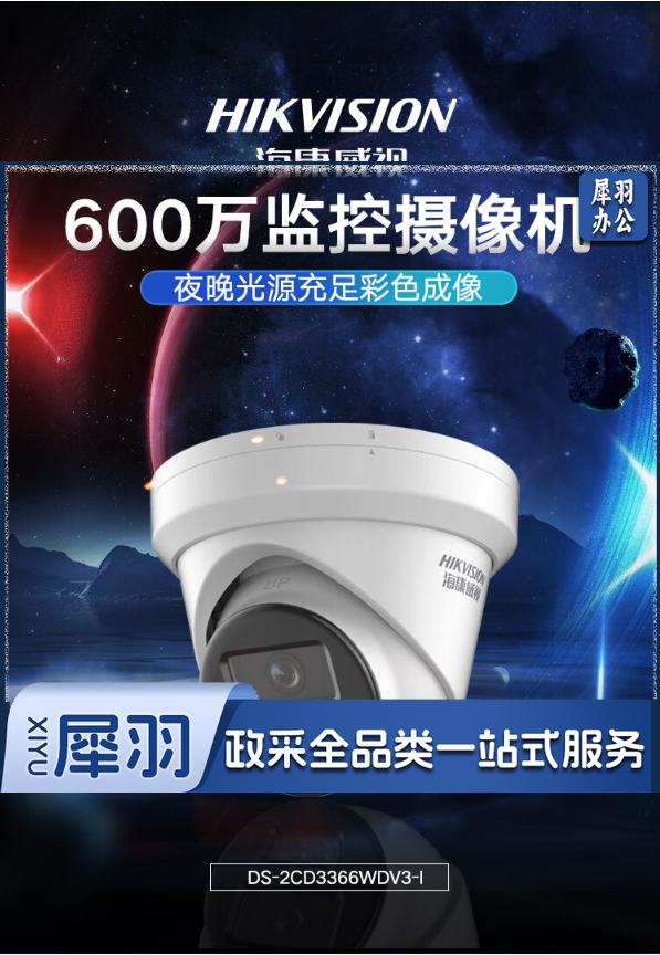海康威视 DS-2CD3366WDV3-I 半球型摄像机监控器摄像头poe供电600万高清星光夜视3366WDV3-I 2.8MM