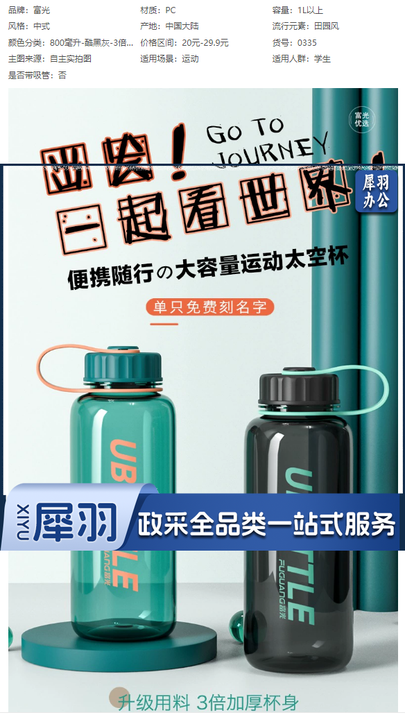 富光大容量太空水壶男士夏季户外运动便携水杯耐高温防摔塑料杯子