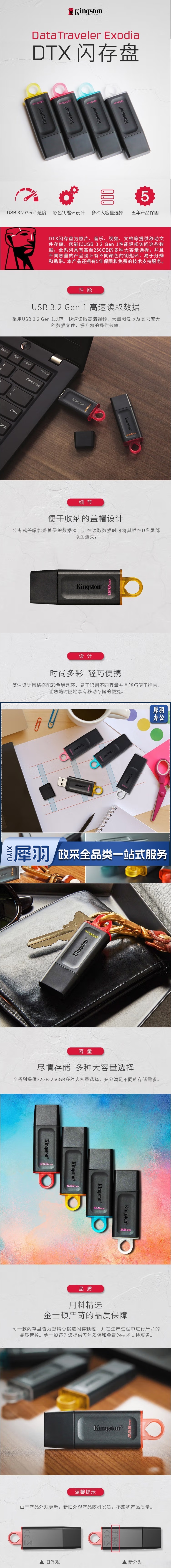 金士顿 DTX 128GB USB3.2 Gen 1 U盘 DTX 时尚设计 轻巧便携