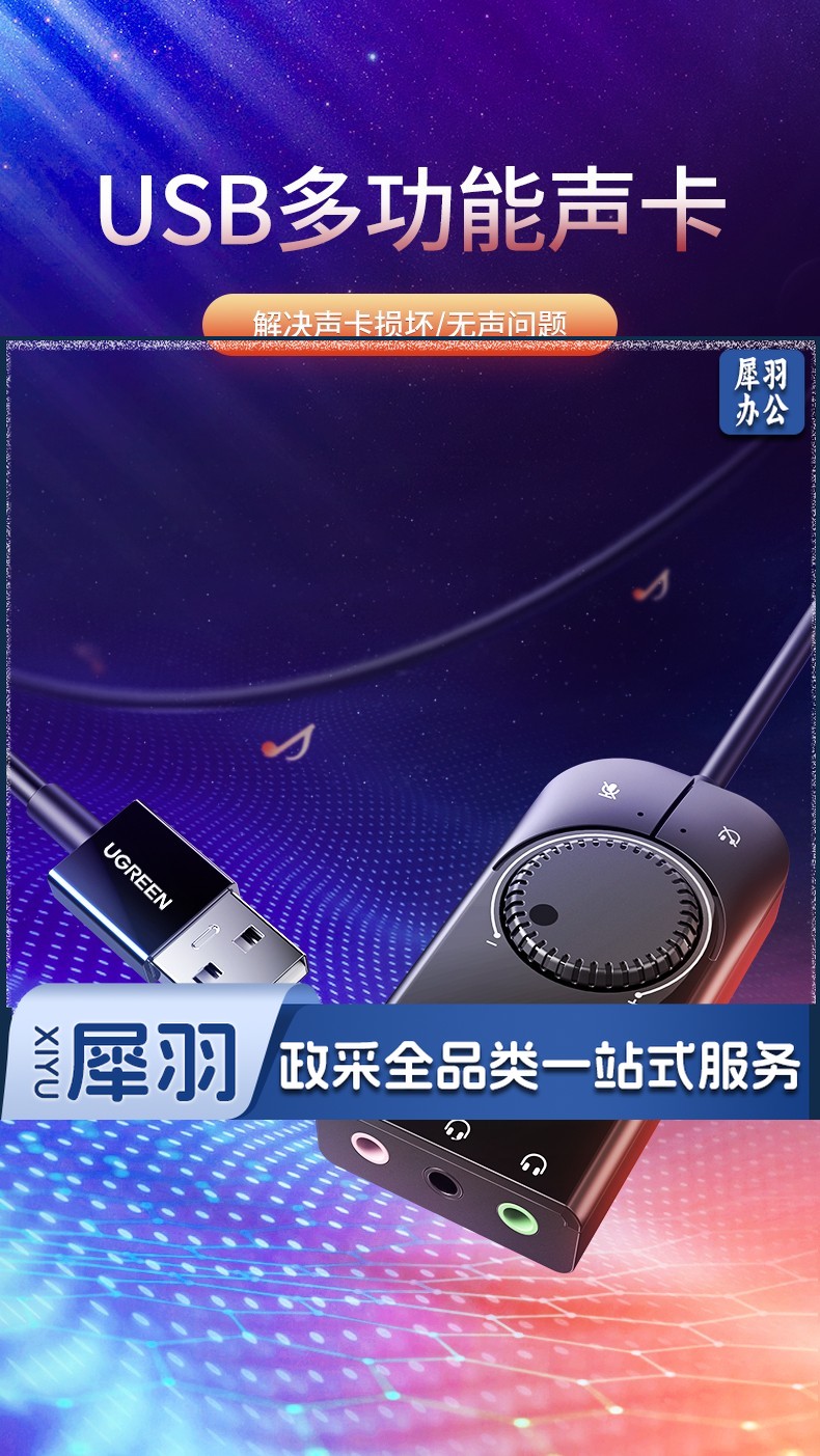 绿联(UGREEN)50599 CM129 USB外置声卡 笔记本电脑PS4接3.5mm接口音频耳机麦克风音响二合一扩展转换器头 1米