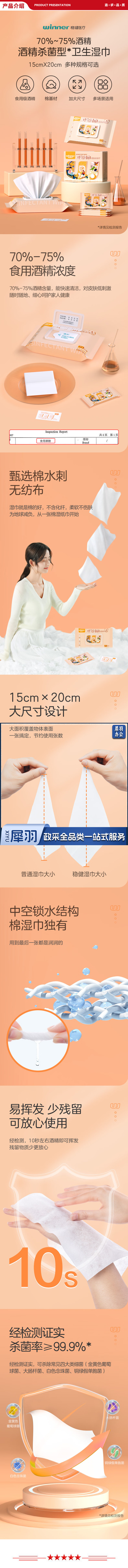 稳健 Winner 606-001564 70%-75%酒精湿巾独立装 全棉材质消毒湿巾食用级酒精杀菌棉片 大尺寸15*20cm 50片/盒
