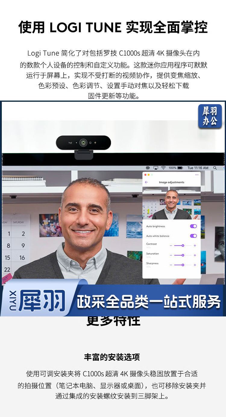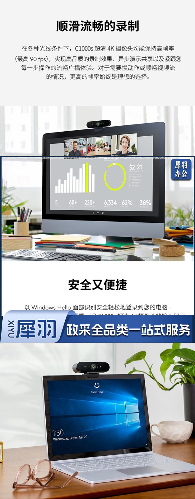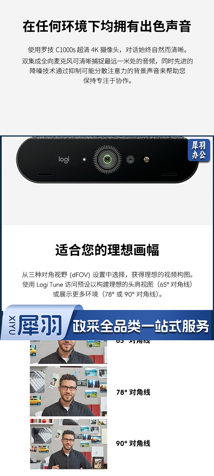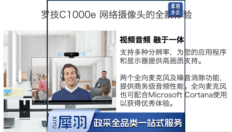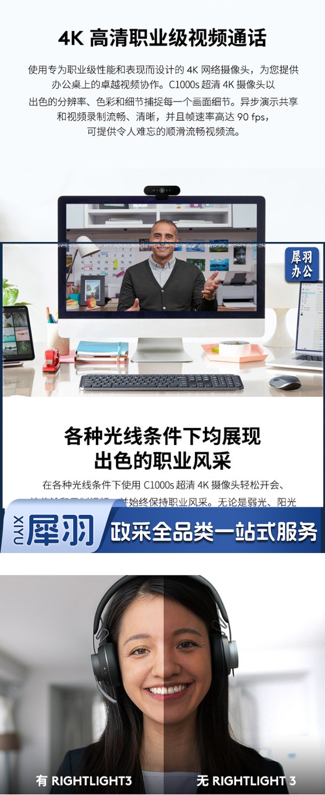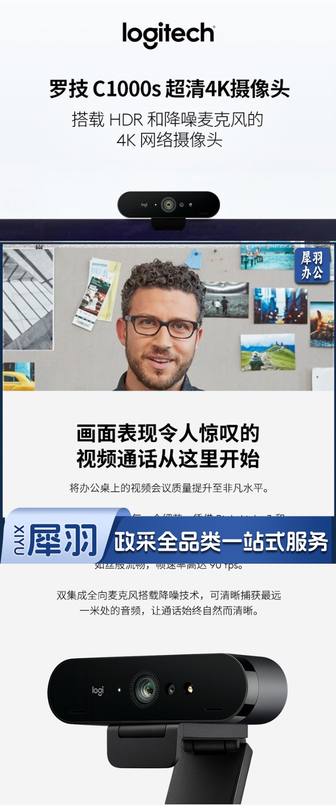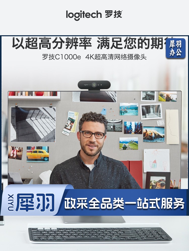罗技(Logitech) C1000e/s 4K高清网络直播摄像头广角家用视频台式电脑摄像头内置麦克 C1000e 4K摄像头+无线领夹麦克风套装
