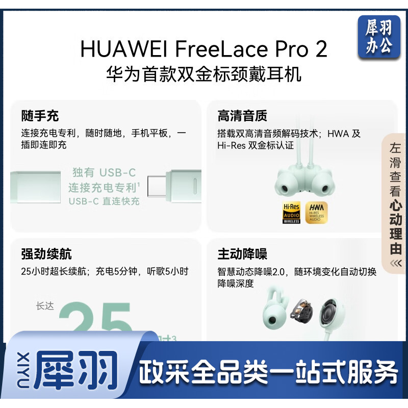 华为新品FreeLace Pro 2 蓝牙耳机无线耳机 颈挂式/USB-C直连快充/高音质/长续航/主动降噪 雅丹黑