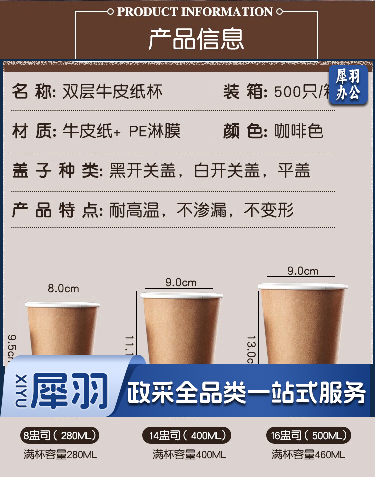 一次性加厚双层牛皮纸杯 400ml 不带盖 100个装